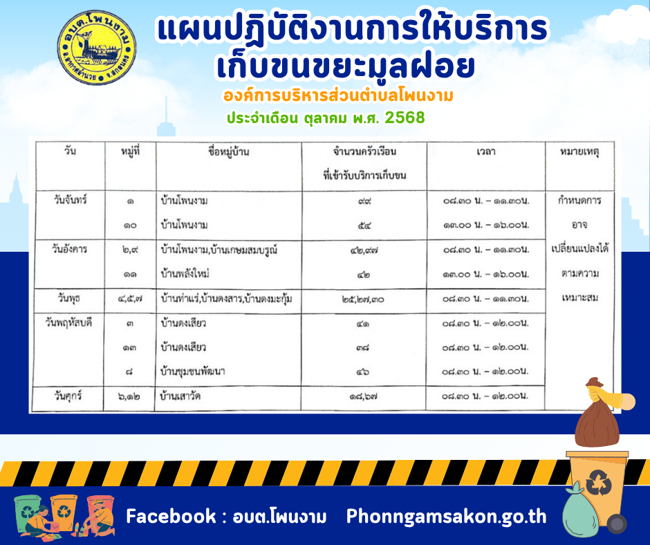 Posted in ข่าวประชาสัมพันธ์ แผนปฏิบัติงานการให้บริการเก็บขนขยะมูลฝอยองค์การบริหารส่วนตำบลโพนงามประจำเดือนตุลาคม พ.ศ. 2568 admin
