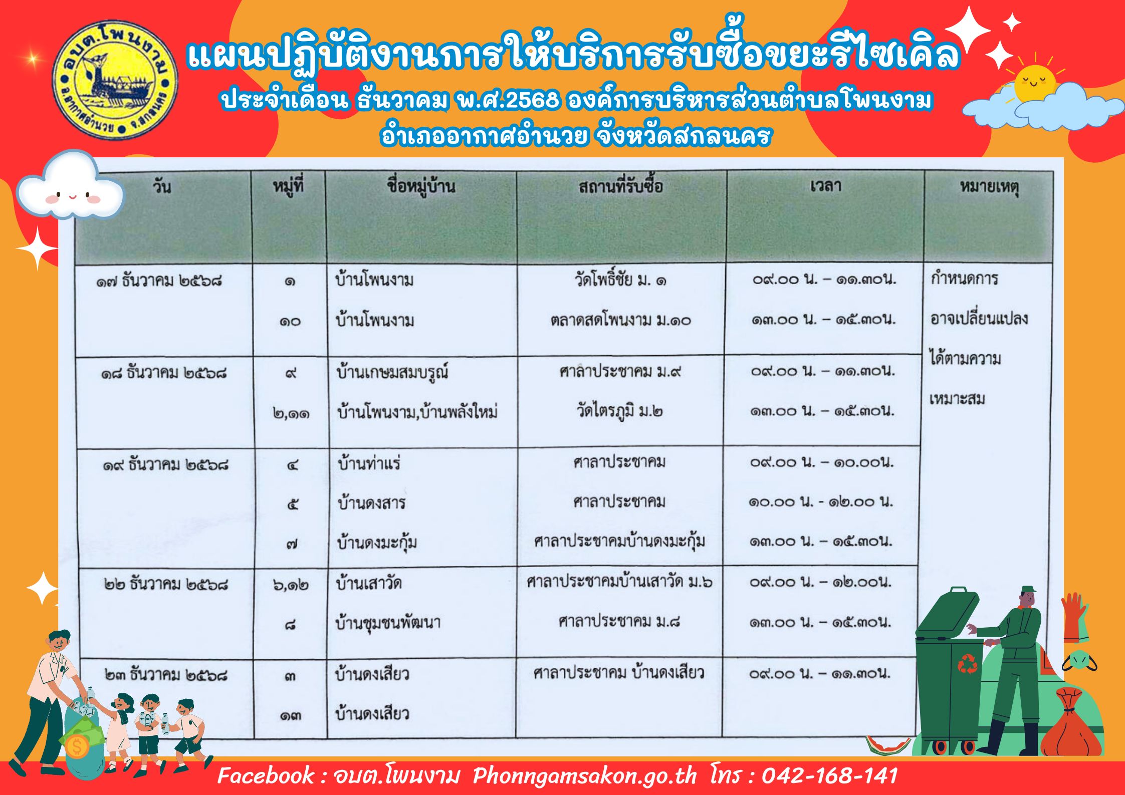 Posted in ข่าวประชาสัมพันธ์, ข่าวเด่น แผนปฏิบัติงานการให้บริการรับซื้อขยะรีไซเคิล ประจำเดือน ธันวาคม พ.ศ.2568 admin