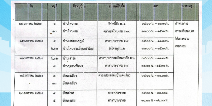 12-01-2569 แผนปฏิบัติงานการให้บริการรับซื้อขยะรีไซเคิล ประจำเดือน มกราคม 2569 08-01-2569 ขอเชิญชวนผู้มีสิทธิเลือกตั้งทุกท่าน ไปใช้สิทธิเลือกตั้ง 08-01-2569 สีบัตรเลือกตั้งที่ใช้ในการเบือกตั้ง อบต. ที่จะมีการเบือกตั้งในวันอาทิตย์ที่ 11 มกราคม 2569