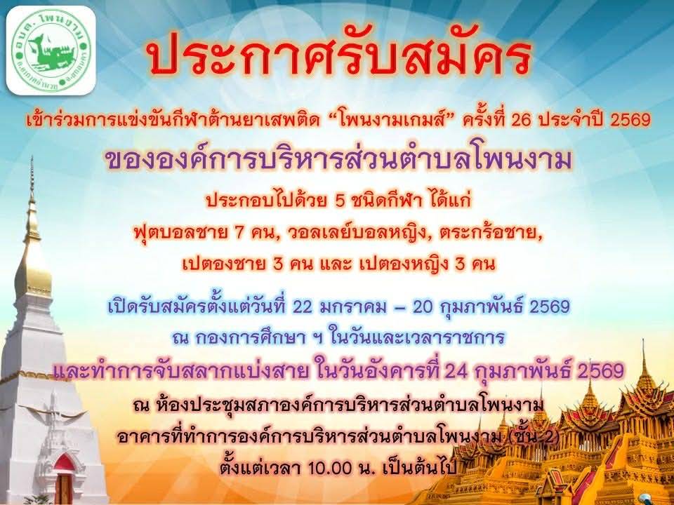 Posted in ข่าวประชาสัมพันธ์ ประชาสัมพันธ์ การจับฉลากแบ่งสายแข่งขันกีฬาต้านยาเสพติด”โพนงามเกมส์” ครั้งที่ 26 ประจำปี 2569 วันที่ 24 กุมภาพันธ์ 2569 ณ ห้องประชุมสภาองค์การบริหารส่วนตำบลโพนงาม เวลา 10.00 น. admin