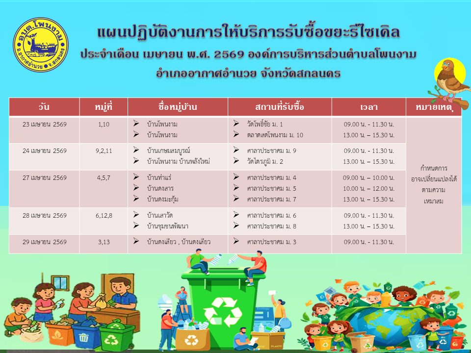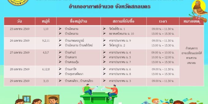 Posted in ข่าวเด่น แผนปฏิบัติงานการให้บริการรับซื้อขยะรีไซเดิล ประจำเดือน เมษายน พ.ศ. 2569 องค์การบริหารส่วนตำบลโพนงาม อำเภออากาศอำนวย จังหวัดสกลนดร admin