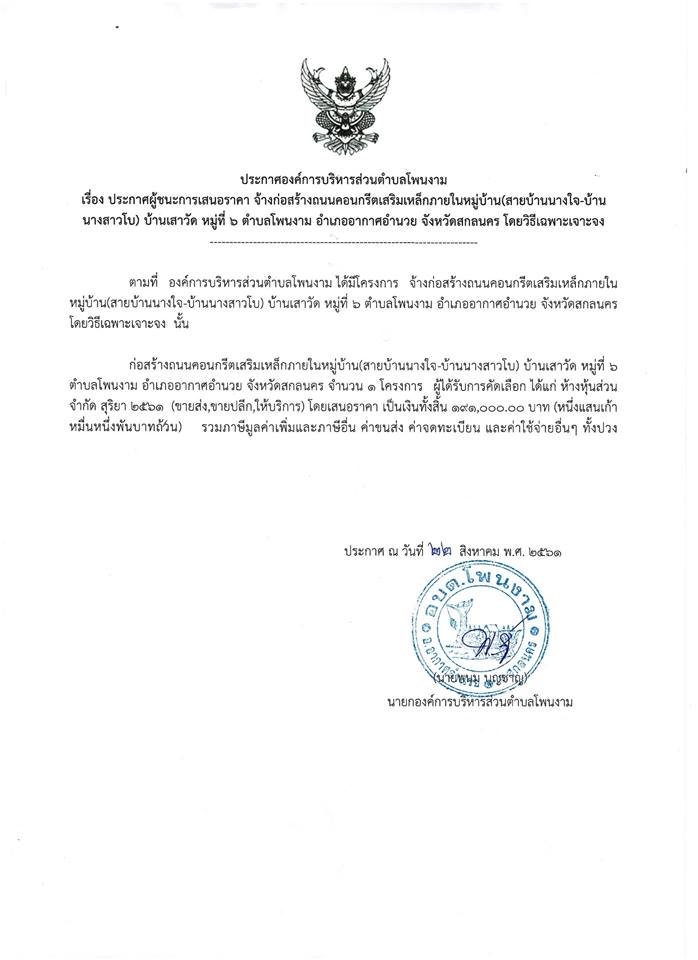 Posted in ข่าวประกวดราคา ประกาศองค์การบริหารส่วนตำบลโพนงาม เรื่อง ประกาศผู้ชนะการเสนอราคา โครงการก่อสร้างถนนคอนกรีตเสริมเหล็กภายในหมู่บ้าน(สายบ้านนางใจ-บ้านนางสาวโบ) บ้านเสาวัด หมู่ที่ 6 ตำบลโพนงาม อำเภออากาศอำนวย จังหวัดสกลนคร admin